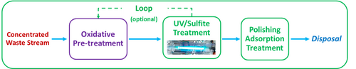 A commercial UV/sulfite treatment system designed and developed by Haley and Aldrich (EradiFluorTM[1] includes an optional pre-oxidation step to transform PFAS precursors (when present) and treatment by UV/sulfite reduction to break C-F bonds. The effluent from the treatment process can be sent back to the influent of a pre-treatment separation system (such as a foam fractionation, regenerable ion exchange, or a membrane filtration system) for further concentration or sent for off-site disposal in accordance with relevant disposal regulations. A conceptual treatment process diagram is shown in Figure 1.