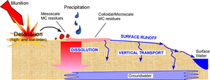 | + | [[File: FullerFig2.png | thumb | 300 px | Figure 2. Conceptual illustration of munition constituent production and transport on military ranges. Mesoscale residues are qualitatively defined as being easily visible to the naked eye (e.g., from around 50 µm to multiple cm in size) and less likely to be transported by moving water. Microscale residues are defined as <50 µm down to below 1 µm, and more likely to be entrained in, and transported by, moving water as particulates. Blue arrows represent possible water flow paths and include both dissolved and solid phase energetics. The red vertical arrow represents the predominant energetics dissolution process in close proximity to the residues due to precipitation.]] | ||