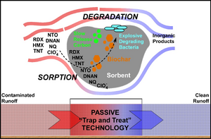 Past and ongoing military operations have resulted in contamination of surface soil with munition constituents (MC), which have human and environmental health impacts. These compounds can be transported off site via stormwater runoff during precipitation events. Technologies to “trap and treat” surface runoff before it enters downstream receiving bodies (e.g., streams, rivers, ponds) (see Figure 1), and which are compatible with ongoing range activities are needed. This article describes a passive and sustainable approach for effective management of munition constituents in stormwater runoff.