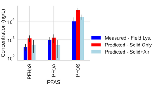 Results from suction lysimeters studies and field lysimeter studies show that PFAS concentrations in porewater predicted from soil concentrations using Equations 1 and 2 generally have reasonable agreement with measured in situ porewater data when air-water interfacial partitioning is considered. Results show that for less hydrophobic components like PFOA, the impact of air-water interfacial adsorption is less significant than for highly hydrophobic components like PFOS. The soil for the field lysimeter in Figure 3 was a sandy soil with a relatively low air-water interfacial area. The effect of air-water interfacial partitioning is expected to be much more significant for a greater range of PFAS in soils with high capillary pressure (i.e. silts/clays) with higher associated air-water interfacial areas