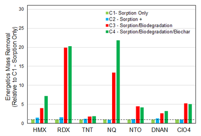The ability of biochar to sorb and abiotically reduce legacy and insensitive munition constituents, as well as biochar’s use as an electron donor for microbial biodegradation of energetic compounds was examined. Batch experiments indicated that biochar was a reasonable sorbent for some of the energetics (RDX, DNAN), but could also serve as both an electron acceptor and an electron donor to facilitate abiotic (RDX, DNAN, NTO) and biotic (perchlorate) degradation (Figure 3)[54].