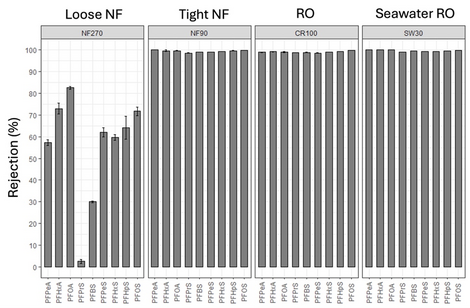 11. ^ 11.0 11.1 11.2 11.3 Safulko, A., Cath, T.Y., Li, F., Tajdini, B., Boyd, M., Huehmer, R.P., Bellona, C., 2023. Rejection of perfluoroalkyl acids by nanofiltration and reverse osmosis in a high-recovery closed-circuit membrane filtration system. Separation and Purification Technology, 326, Article 124867. doi: 10.1016/j.seppur.2023.124867 Open Access Manuscript