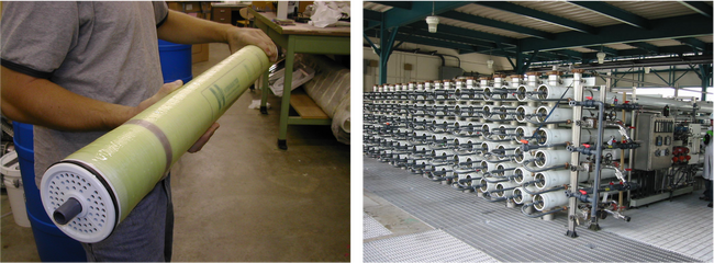 Figure 2. (Left) Spiral-wound membrane element with the feed side of the element and permeate collection tube in the middle visible. (Right) 1-million gallon per day membrane system with multiple pressure vessels.
