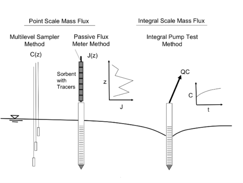 The two general methods for measuring mass flux, J(x,y,z) and mass discharge (MD) based on spatiotemporal scales of measurement (Figure 1) are point scale techniques and integral scale techniques. Point scale techniques include multilevel samplers and passive flux meters within screened wells[6]. Both point scale methods collect data to determine the local mass flux [mass per unit area per time, M/L2/T] that can then be spatially integrated to determine mass discharge [M/T]. Alternatively, integral methods such as integral pump tests[7][8], collect data averaged over large volumes of water pumped from fully screened wells.