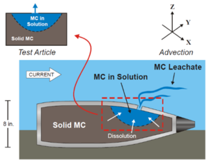 [[File:Lotufo1w2Fig6.png|thumb|left|Figure 6. Experimental determination of MC release rate from a perforated munition in a large flume.]]