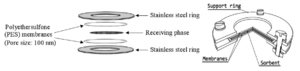 [[File:Lotufo1w2Fig3.png|thumb|left|Figure 3. the structure of a POCIS where stainless steel encompasses the PES membranes and the adsorbent in the middle (from Morin et al. 2012 and Seethapathy et al. 2008)<ref name = "Morin2012">Morin, N., Miège, C., Coquery, M. and Randon, J., 2012. Chemical calibration, performance, validation and applications of the polar organic chemical integrative sampler (POCIS) in aquatic environments. TrAC Trends in Analytical Chemistry, 36, pp.144-175. doi: 10.1016/j.trac.2012.01.007 [[media:2012-Morin-Chemical_Calibration_Performance%2C_Validation%2C_and_applications...POCIS.pdf| Author's Manuscript]]</ref><ref>Seethapathy, S., Gorecki, T. and Li, X., 2008. Passive sampling in environmental analysis. Journal of Chromatography A, 1184(1-2), pp.234-253. [https://doi.org/10.1016/j.chroma.2007.07.070 doi: 10.1016/j.chroma.2007.07.070]</ref>.]]