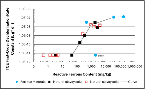 If Fe(II)r is ≥ 100 mg/kg, a first-order dechlorination rate constant can be estimated and subsequently used within a contaminant fate and transport model. However, if acetylene is detected in the clay, even with Fe(II)r less than 100 mg/kg, then bench-scale testing using methods similar to those described in a recent study[1] is recommended, as such results would likely be inconsistent with those shown in Figure 1, suggesting some other mechanism might be involved, or that the system mineralogy might be more complex than anticipated. Even if Fe(II)r ≥ 100 mg/kg, confirmatory bench-scale testing may be conducted for additional verification and to refine estimation of the abiotic dechlorination rate constant.