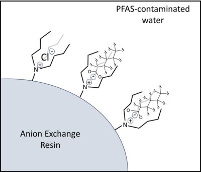 Anion exchange is an adsorptive treatment technology that uses polymeric resin beads (0.5–1 mm diameter) that incorporate cationic adsorption sites to remove anionic pollutants from water[3]. Anions (e.g., NO3-) are adsorbed by an ion exchange reaction with anions that are initially bound to the adsorption sites (e.g., Cl-) during resin preparation. Many per- and polyfluoroalkyl substances (PFAS) of concern, including perfluorooctanoic acid (PFOA) and perfluorooctane sulfonate (PFOS), are present in contaminated water as anionic species that can be adsorbed by anion exchange reactions[1][4][5].