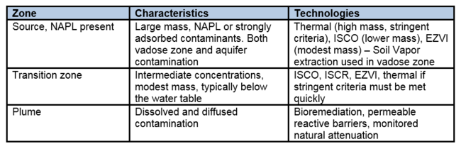 For successful remediation, it is crucial that every site is well understood and that a good site conceptual model (CSM) is developed. A good CSM is the basis for selecting remedial technologies that are effective in each of the zones. In source zones, technologies must often be effective both above and below the water table. There are several commonly applied technologies for the three different zones (Table 1).