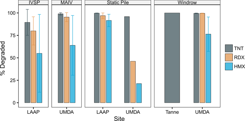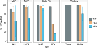 Revision as of 11:28, 5 February 2019 by Debra Tabron (talk | contribs) (Figure 1: Compound reductions for different composting techniques using soils from contaminated ammunition production sites. Error bars are ± 1 standard deviation. IVSP = in-vessel static pile; MAIV = mechanically agitated in-vessel. Data compiled by...)