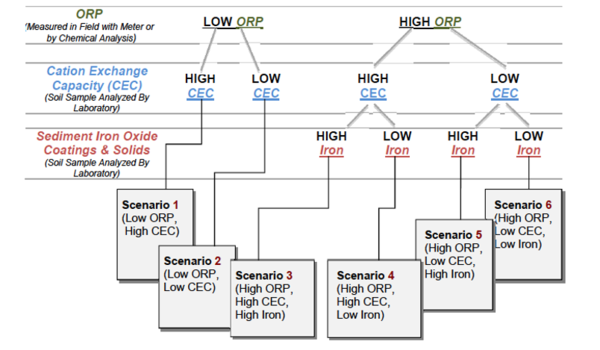 There are six scenarios that are a function of three primary factors: oxidation/reduction potential (ORP); cation exchange capacity (CEC), and sediment iron oxide coatings and solids (Fig. 2). There are three primary factors and three secondary factors (pH, sulfur/sulfide, and total dissolved solids) that combine with the six scenarios to provide a semi-quantitative indicator of mobility (i.e., low mobility is defined as a retardation factor of 1000+) (Table 2). The Scenarios Approach for MNA of Inorganics and Radionuclides is explained in more detail in the video shown in Figure 3.