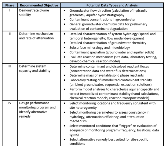 The basis for demonstrating MNA for inorganic contaminants, such as metals and metalloids, is a tiered four-phase strategy (outlined in Table 1).
