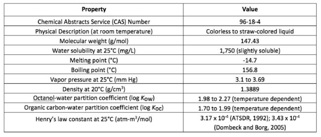 TCP’s fate in the environment is governed by its physical and chemical properties (Table 1). TCP is not anticipated to sorb strongly to soil making it likely to leach into groundwater and exhibit high mobility. In addition, TCP is moderately volatile and can partition from surface water and moist soil into the atmosphere. Because TCP is only slightly soluble and denser than water, it is capable of forming a dense non-aqueous phase liquid (DNAPL). TCP is generally resistant to biodegradation, hydrolysis, oxidation, and reduction under naturally occurring conditions making it highly persistent in the environment[1].