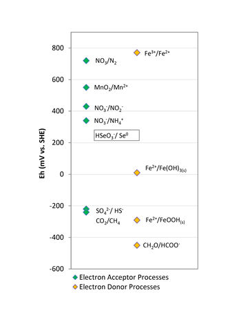 In the case of electron donors, the amendments used in bioremediation applications are typically classified as quick release compounds (lactate, sodium benzoate, molasses, whey) or slow release compounds (emulsified vegetable oils, HRC®, EHC®, ABC®+, mulch, compost). These electron donors are added in anaerobic bioremediation to stimulate conditions conducive to the degradation processes by depleting the dissolved oxygen (DO), and other terminal electron acceptors, and lowering the oxidation-reduction potential of groundwater. In addition, products of electron donor fermentation (i.e., simple organic acids, hydrogen) are required as an energy source for metabolism of decontaminating microbes. The amount of energy released during electron transfer from the donor is controlled by the redox potential (Eh) of the terminal electron acceptor. Therefore, anaerobic microorganisms typically use available native electron acceptors in the following order of preference: nitrate, manganese and ferric iron oxyhydroxides, sulfate, and finally carbon dioxide (Fig. 1).