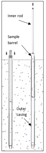 Figure 2. The outer casing of the dual-tube system remains in place to control the bore hole as the inner rod is used to trip out the sample barrel with soil core.