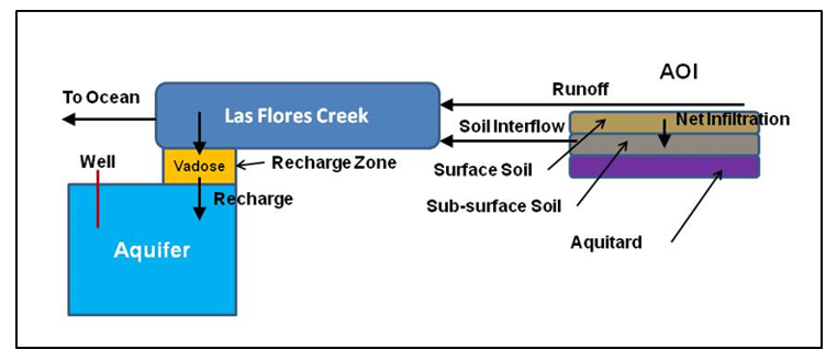 Figure 2. Conceptual Site Model used with TREECS™ Advanced Tier 2 for the Zulu Impact Area (ZIA) and receiving waters, Camp Pendleton, CA. The area of interest (AOI) is the ZIA.