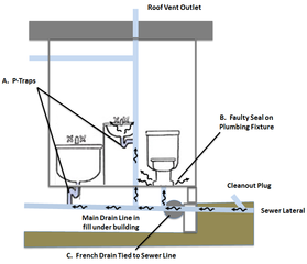 | current | 15:52, 7 May 2019 | 753 × 648 (101 KB) | Debra Tabron (talk | contribs) | Figure 4. Potential Entry Points into Buildings. VOCs can move from sewers and utility tunnels into buildings through a variety of features, for example: A. Dry p-traps; B. Faulty seal on plumbing fixture (e.g., Pennell et al. 2013); and C. French dr... |