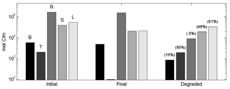 Figure 3. Concentrations integrated over 2D cross-sectional area for modeled five oil phase components (B: BEX, T: toluene, N: NVDOC, S: short chain n-alkanes, L: long chain n-alkanes), at the initial time of the spill, at the final simulation time (10,000 days), and for the degraded amount over the simulation period. For each component, the percentage of its initial amount that is degraded at the end of the simulation period is printed in parentheses. Figure reprinted from Ng et al. 2015.
