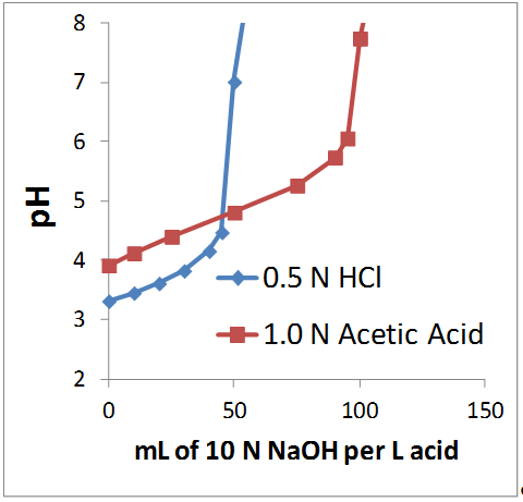 Fig 3. Titration of two acids (0.5 N HCl and 1.0 N acetic acid with 10 N NaOH)
