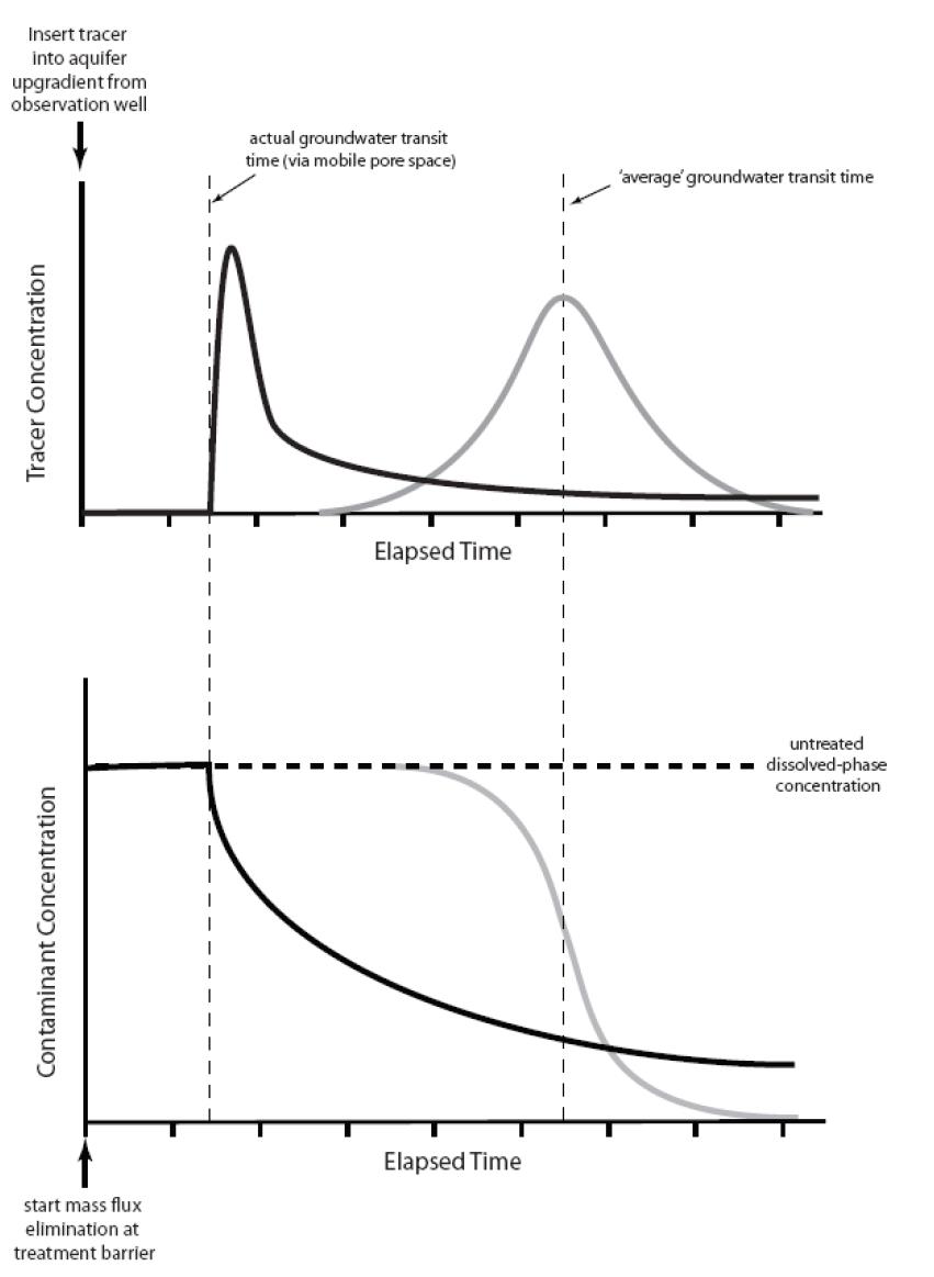 Newell Figure 4. Comparison of tracer breakthrough (upper graph) and cleanup curves from advection-dispersion based (gray lines) and advection-diffusion based (black lines) solute transport