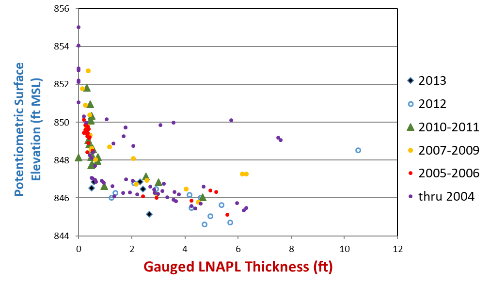 Figure 4. Gauged LNAPL thickness versus potentiometric surface elevation through time showing 10 years of LNAPL recovery with little to no change in LNAPL thickness.