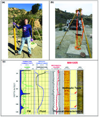 Figure 1. Example borehole logging equipment and log panel from the U. Connecticut Landfill in which major fractures appear in multiple logs for well MW105R at ~110 ft, 90 ft, and 75 ft depths (after Johnson et al., 2002.(a) Borehole tool outside of the