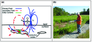 Figure 2. Example of a surface-based geophysical method. (a) Schematic diagram of an electromagnetic induction tool in operation, which comprises a transmitter (Tx) and receiver (Rx) to respectively produce a primary electromagnetic field and measure a secondary electromagnetic field affected by the Earth’s electrical structure. (b) Photograph showing a multi-frequency electromagnetic induction tool in operation at a remediation site in Brandywine, MD.
