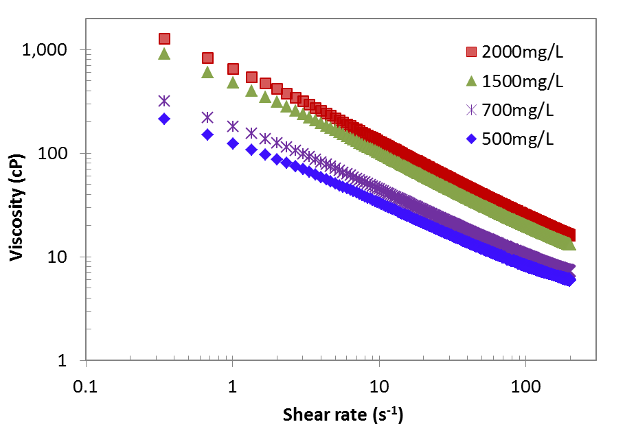 | current | 15:42, 30 June 2016 | 910 × 631 (32 KB) | Debra Tabron (talk | contribs) | Figure 1. Xanthan gum concentration influence on fluid viscosity and rheology for several xanthan concentrations. All solutions were made in de-ionized water. |