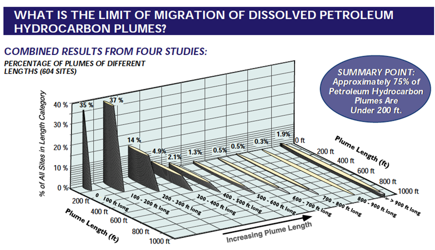 Figure 1. Distribution of BTEX plume lengths from 604 hydrocarbon sites (Newell and Connor, 1998)