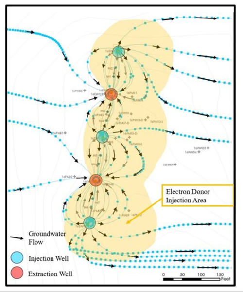 Once the amendment is distributed, the injection and recirculation process is shut down and the natural flow of groundwater carries groundwater through the zone where the amendment is present (Fig. 2, right panel). Contaminants in the groundwater flowing through this zone are treated as they contact the amendments.