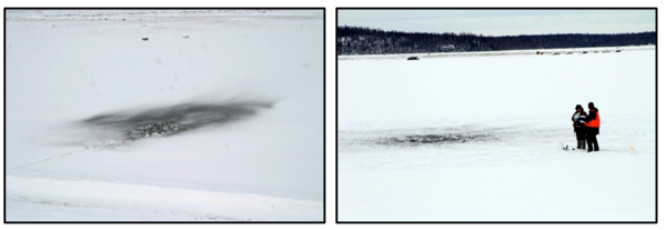 Mass deposition measurements of munitions detonations first occurred in response to the closure of the Eagle River Flats (ERF) impact area on Fort Richardson in Alaska[9]. Howitzer rounds were fired into the Flats in winter to try to determine if explosives or white phosphorus could be detected in the residues deposited on the snow surface[10]. A sampling process was developed for residues on snow, but sampling bias and cross-contamination from prior range activities proved problematic until testing was moved to an impact area underlain by ice in 2002 (Fig. 2)[11]. In 2004, winter tests conducted on snow-covered ice at the ERF impact area demonstrated that estimates of per-round energetic residues can be obtained using the recently developed, multi-increment sampling protocol[12]. All detonation tests have since been conducted using a variation of this method[13]. The method is constantly refined, with several quality assurance procedures incorporated, as well as streamlining of the initial sample processing and reduction of cross contamination of samples in the field and the lab.