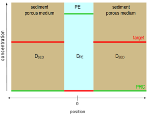 Figure 2b. After the PE has been deployed for a time, the PRC is depleted from the PE (green lines), especially near the surfaces contacting the sediment, and its concentration is building up outside the PE and diffusing away into the sediment. Meanwhile, the target chemical leaves the sediment and begins to diffuse into the PE (red lines). The "jumps" in concentration at the PE-sediment boundary reflect the equilibrium partitioning coefficient,